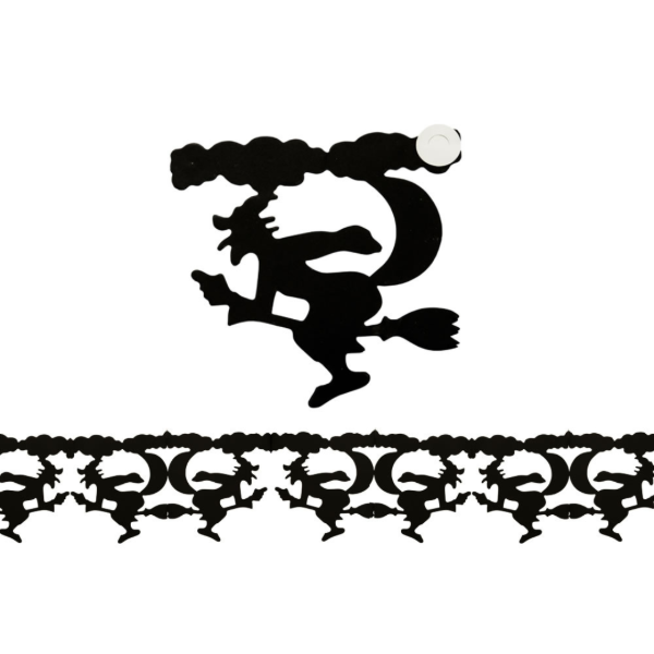 - Guirnalda de papel con corte de bruja volando en escoba - Medida aproximada: 23cm de alto x 2mts de alto